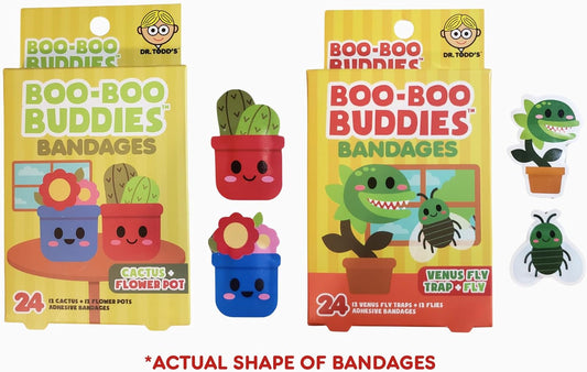 2-Pack Boo Boo Buddies™ Cactus + Flower Pot & Venus Fly Trap + Fly Bandages Bundle | 48 Ct Fun Shapes for Kids | Waterproof, Latex-Free, Gentle on Sensitive Skin