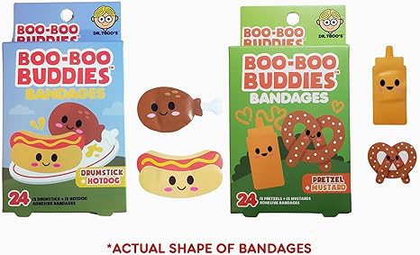 2-Pack Boo Boo Buddies™ Drumstick + Hot Dog and Pretzel + Mustard Bandages | 48 Ct | Food-Themed Adhesive Bandages for Kids | Waterproof, Latex-Free, Sensitive Skin Safe | Fun First Aid for Cuts & Scrap
