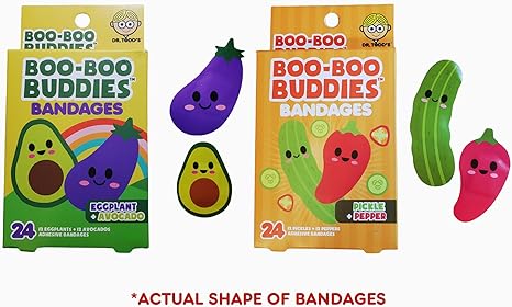 2-Pack Boo Boo Buddies™ Eggplant + Avocado & Pepper + Pickle Shape Bandages Bundle – 48 Ct | Waterproof, Latex-Free Fun First Aid for Kids & Adults