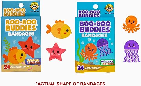 2-Pack Boo Boo Buddies™ Goldfish + Starfish & Jellyfish + Octopus Bandages Bundle | 48 Ct Fun Shapes for Kids | Waterproof, Latex-Free, Gentle on Sensitive Skin