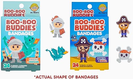 2-Pack Boo Boo Buddies™ Knight & Dragon Bandages + Pirate & Skull Bandages - 48 Ct Each | Fun Shaped Kids Bandages | Latex-Free, Waterproof, Gentle on Skin | Perfect for First Aid Kits & Party Favors