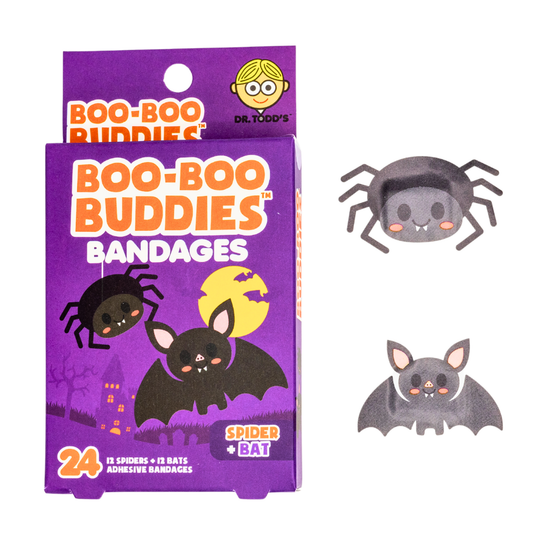Spider & Bat Shape Kids Bandages – Boo Boo Buddies® 24 Count | Fun Halloween Bandage Box