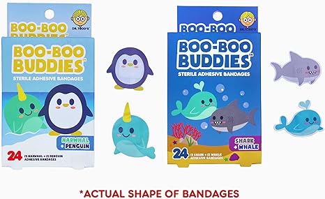 2-Pack Boo Boo Buddies™ Shark + Whale and Narwhal + Penguin Bandages – 48 Ct | Fun, Waterproof, Latex-Free Bandages for Kids | First Aid Adhesive Bandages for Sensitive Skin | Cute Marine Animal Shapes