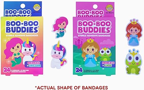 2-Pack Boo Boo Buddies™ 24 Pack Mermaid & Unicorn Shape Bandages + 24 Pack Princess & Frog Shape Bandages – Fun, Latex-Free Kids Bandages for Cuts & Scrapes