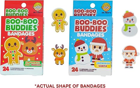 2-Pack Holiday-Themed Bandages for Kids – 24-Pack Santa & Snowman and 24-Pack Gingerbread Man & Rudolf | Waterproof, Latex-Free, Fun Shapes for Sensitive Skin