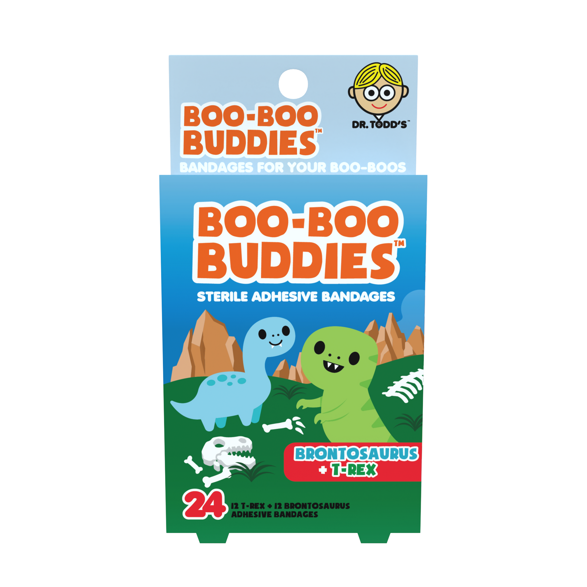 Dinosaur Bandages for Kids (24 Count) Dr. Todd’s Boo-Boo Buddies Dinosaur Bandages turn everyday cuts and scrapes into moments of comfort. Designed to help kids feel better before they heal, these playful dinosaur bandages make first aid less scary and more reassuring for little ones. Each box includes fun dinosaur designs kids love, including classic favorites like brontosaurus and T-rex. Gentle and latex-free, these bandages are made for everyday first aid at home, school, or on the go. Why parents choose Boo-Boo Buddies bandages: