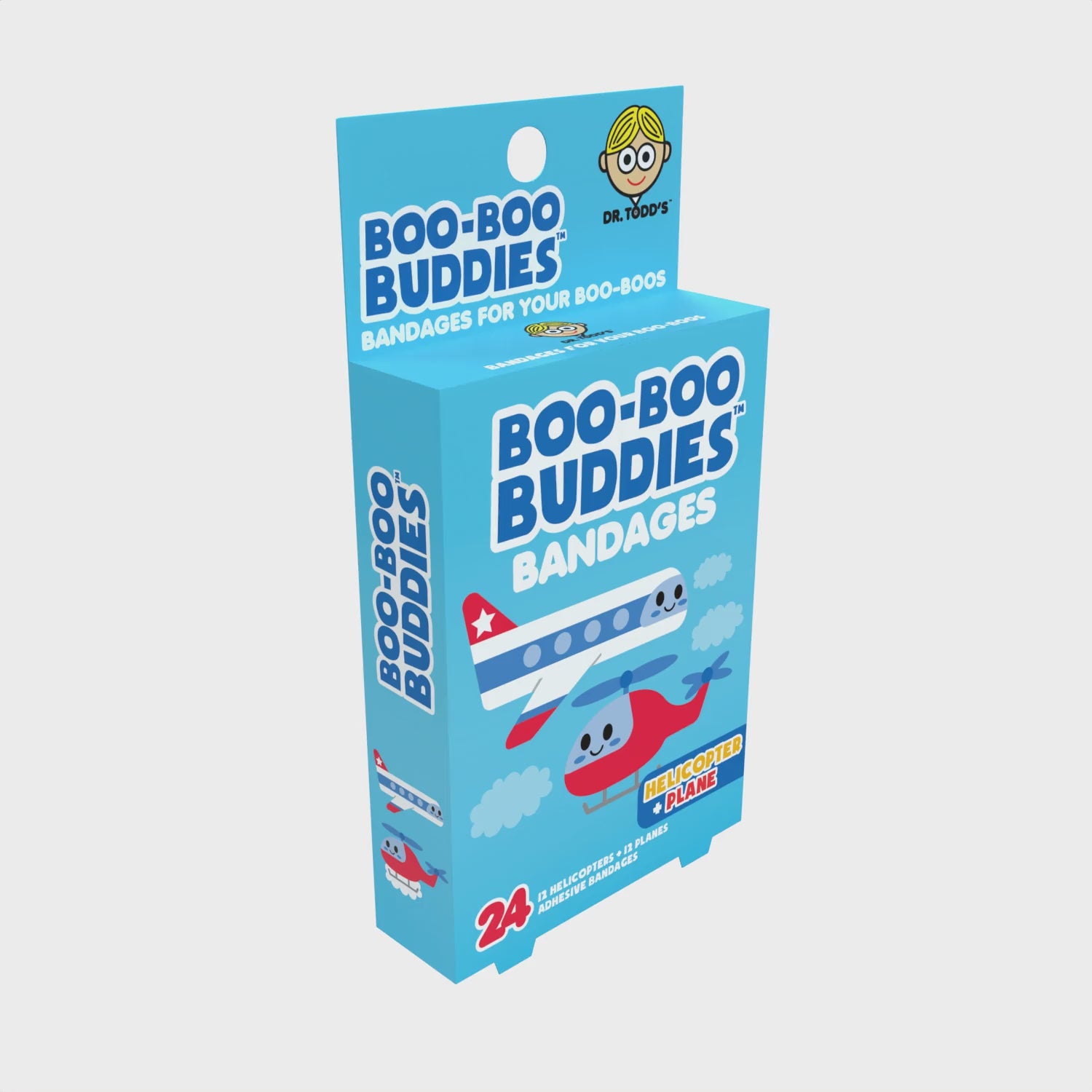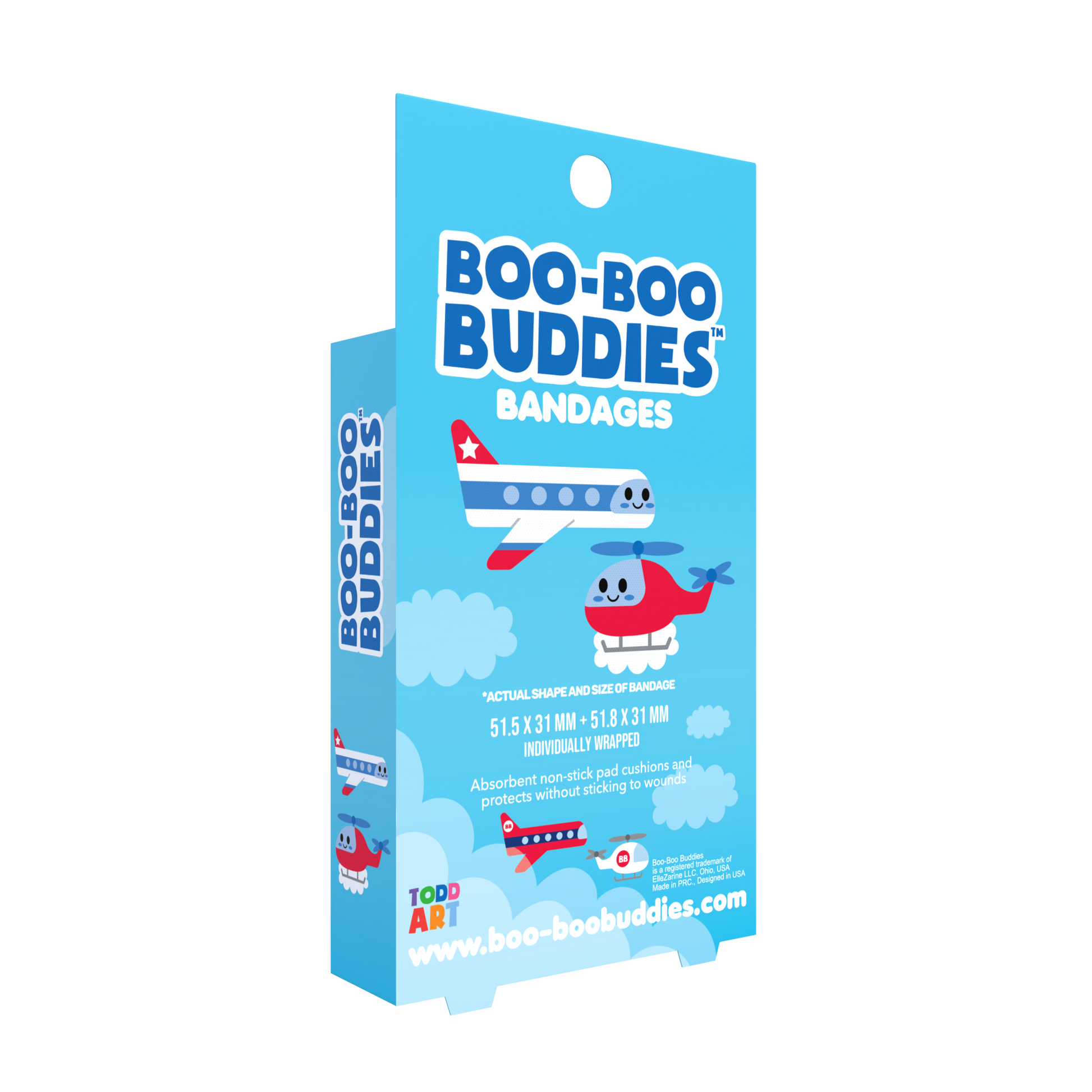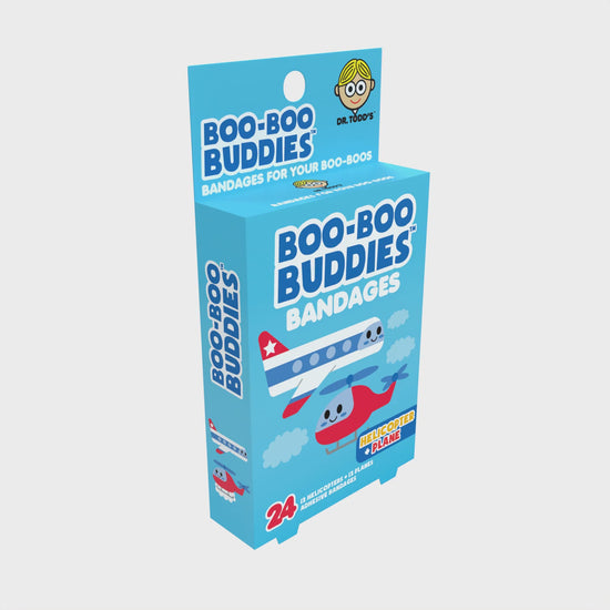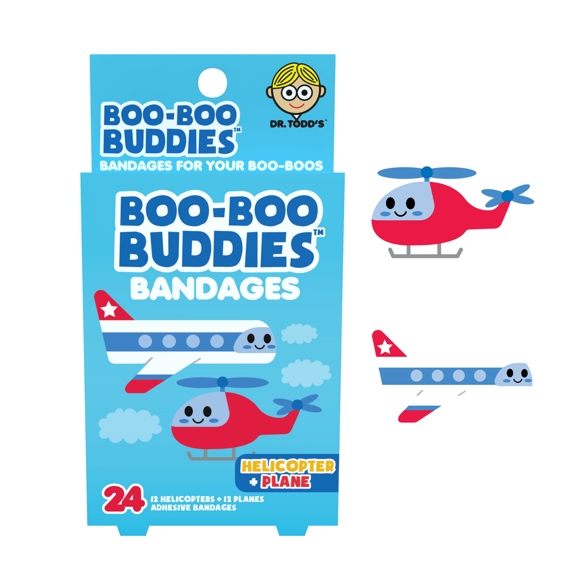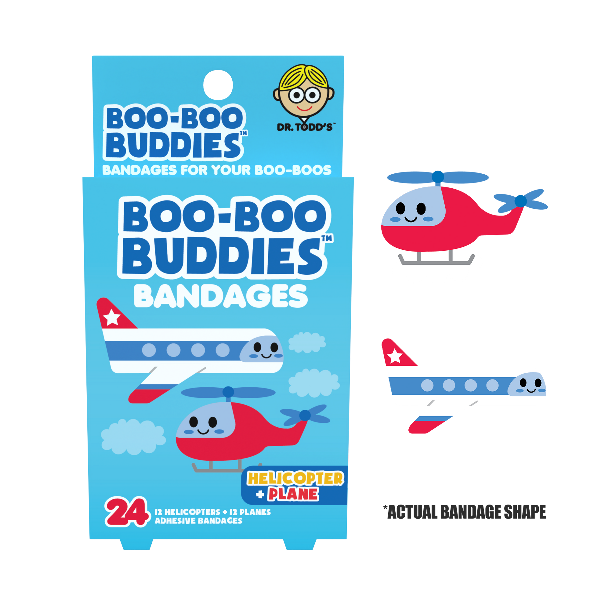 Zoom into first aid fun with Dr. Todd’s Boo-Boo Buddies® Helicopter + Plane Bandages. These adorable shaped bandages add a little lift to healing time with 12 cheerful helicopters and 12 smiling airplanes.