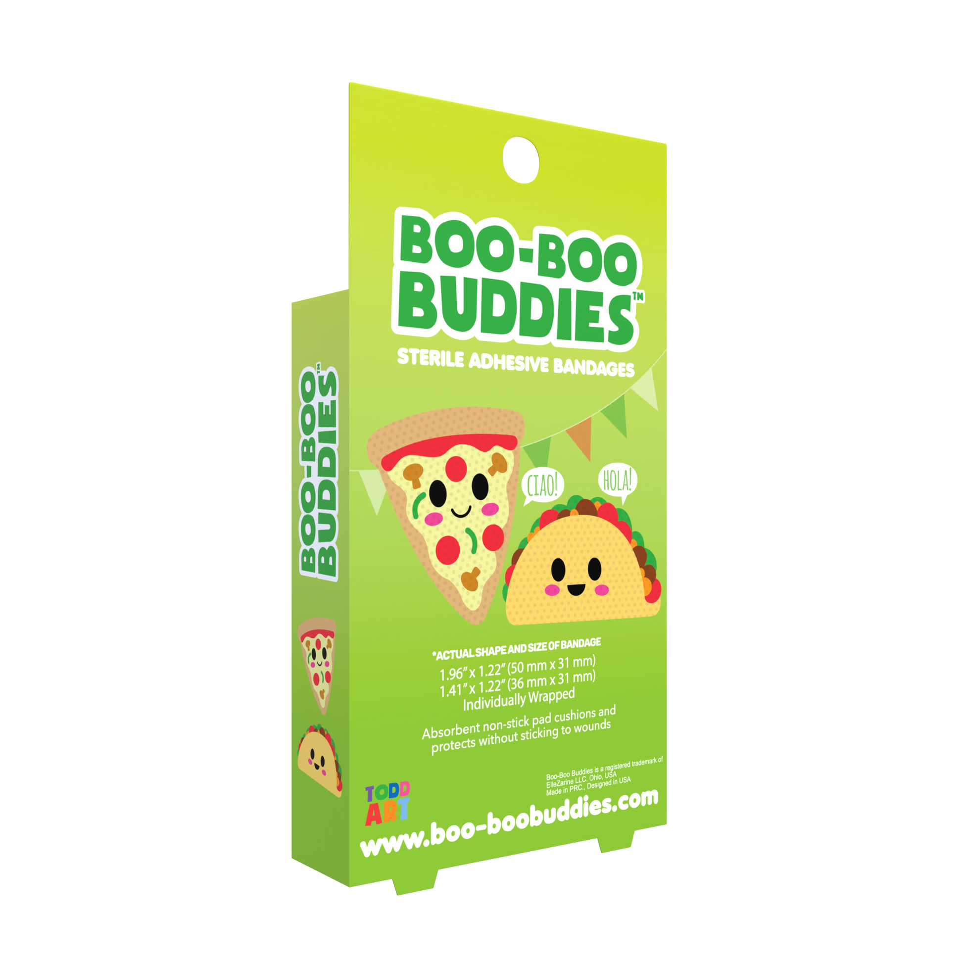 Spice up your first aid kit with Dr. Todd’s Boo-Boo Buddies® Pizza + Taco Bandages! These deliciously adorable die-cut bandages are shaped like smiling slices of pizza and happy tacos — perfect for hungry little imaginations.