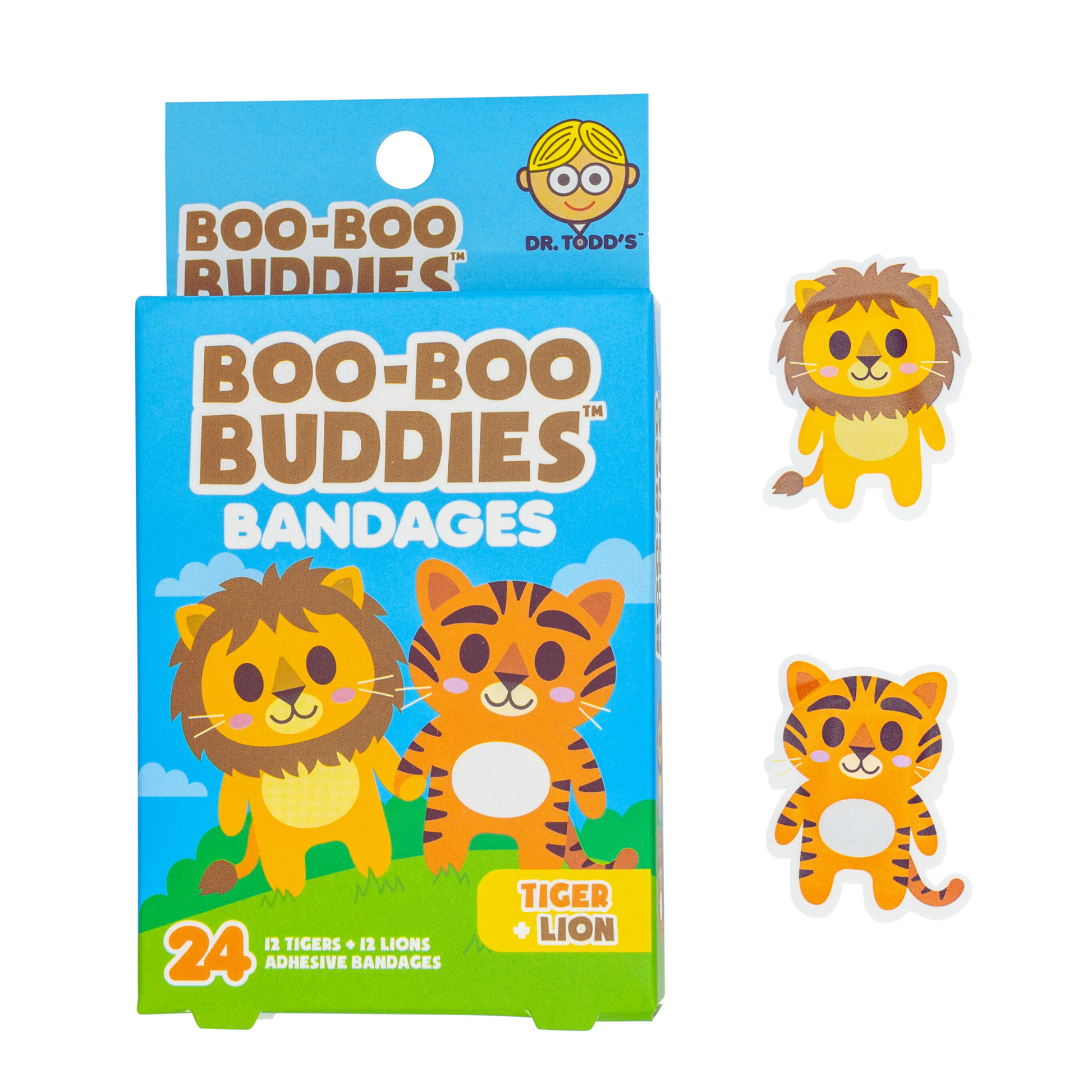 Roar into first aid fun with Dr. Todd’s Boo-Boo Buddies® Tiger and Lion Bandages! These die-cut jungle pals help kids feel brave and comforted with every little scratch and scrape.